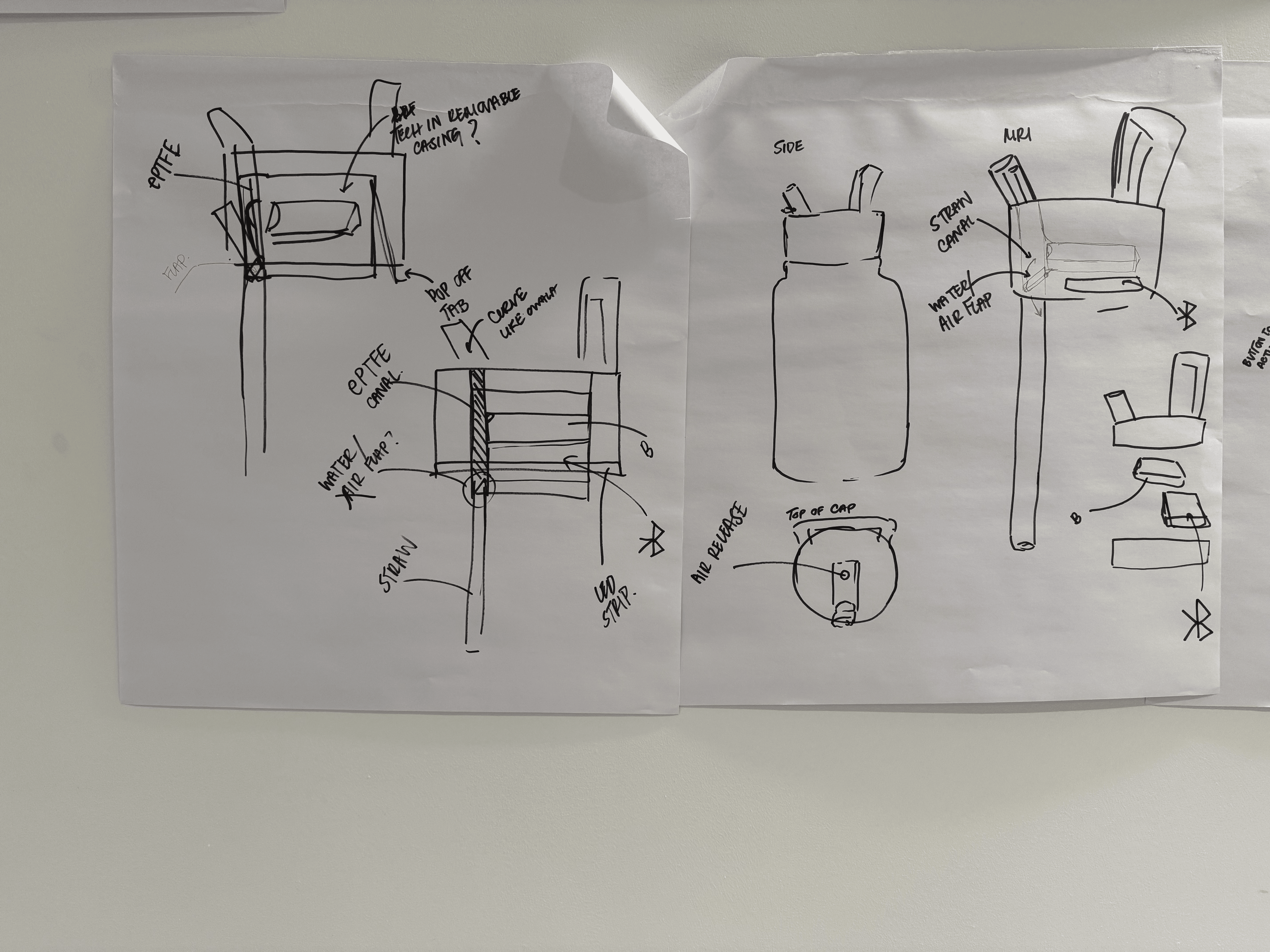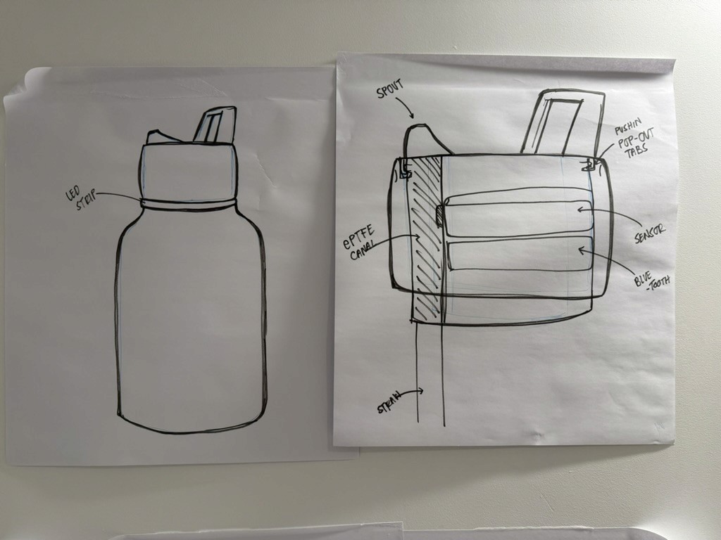 After this, we started to brainstorm the way that this product would work and so many questions came up. The biggest questions we faced were: How would we be able to get air to the water bottle and to the sensor? Where would the sensor sit? How would we keep the water out of the sensor and battery and how do we protect that?