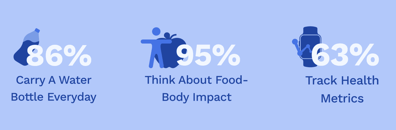 Through this research, we further validated the problem space and the need for a solution in this space. These stats helped validate that a water bottle is a personal item that is constantly used, people think about how food affects their body and people already track their health metrics. It was just that there was no product on the market that streamlines this specifically for gut health.